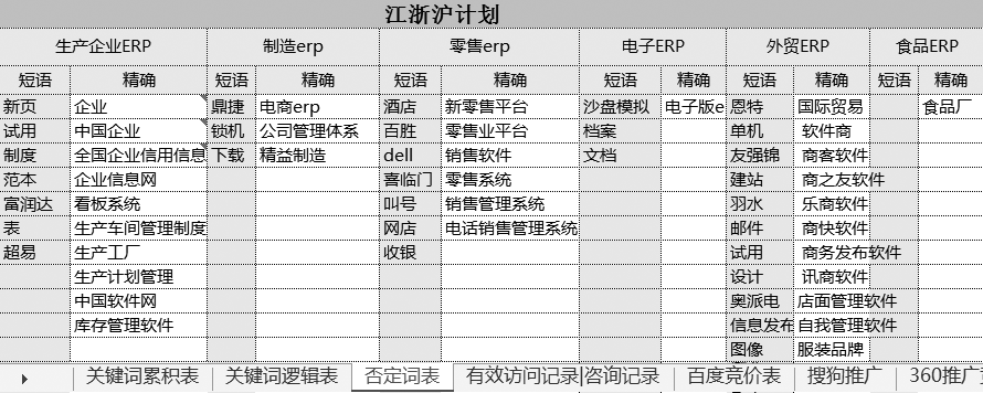 注解:每否定一个词,就需要在该表中找到对应的计划和单元加上去。当然也可以每周或者每月把搜索推广账户里的所有否定词分门别类的填写好。否定词的作用不亚于关键词,日积月累的否定词也是企业网络营销的竞争力,新入门的竞争对手最缺的不是关键词,而是否定词。