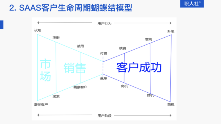 上图右侧的客户成功是 SaaS 产品的和核心部门之一,他们很重要的一个职责就是与产品团队配合,提高用户的 LTV,即用户整个生命周期的价值。由于 SaaS 产品的商业模式是按年或月订阅,如果用户只是购买产品而后期不续费,对公司来说很可能是一笔亏本的生意。因此只有用户持续地订阅,通过后续的续费或增购,公司才有可能真正实现盈利。