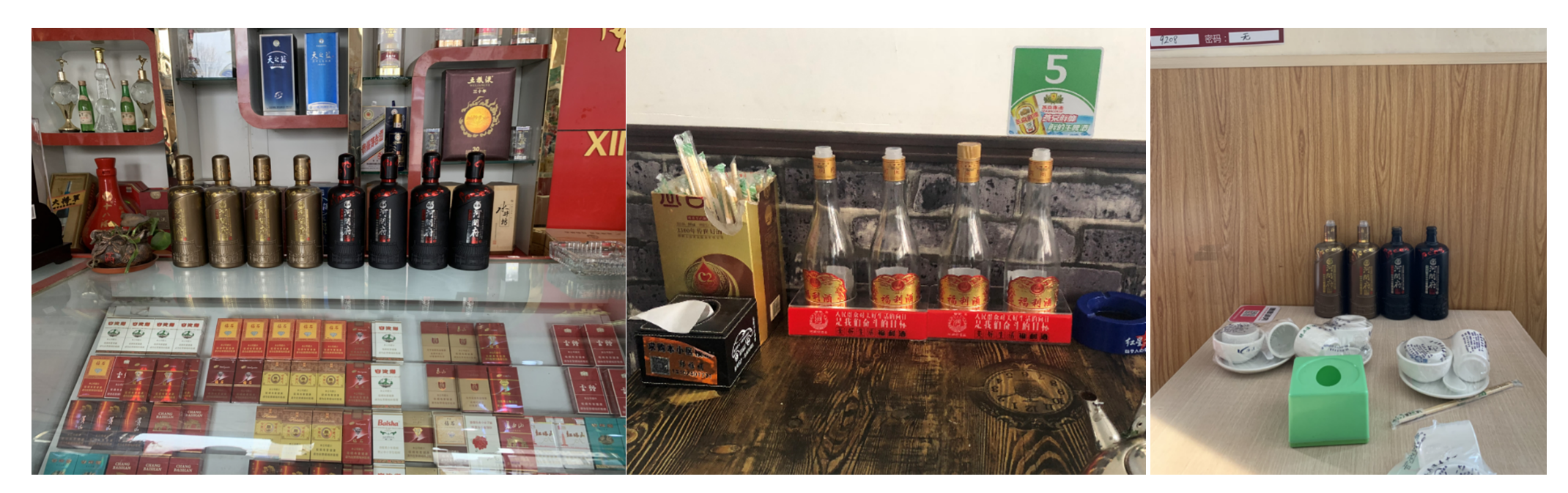 以县域市场为例,陈列400张桌子(烟酒店吧台100家+30家核心餐饮),每桌摆2~4瓶(烟酒店可摆放品鉴酒);其中30家核心餐饮店,每家平均摆10张桌子,合计300张桌子+100个烟酒店的吧台或者烟柜陈列。原则上餐饮摆放的桌子必须靠墙或者有倚靠的位置,每桌摆放2~4瓶空瓶,如图7-3所示。在执行的过程中可根据店内桌子数量及实际情况进行调整。成熟型市场尽量摆空瓶(摆台时间6个月,陈列奖励本品品鉴酒、矿泉水、饮料等),导入期市场摆成品(资源有限的情况下摆放3个月)。