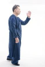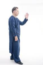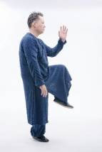 4.右脚不动,以脚心之回劲带动左虚脚之膝浮起,左手肘置于左脚膝盖上,向上荡起,同时右手沉落于右腿旁中指微微翘起,左膝至大腿与胯平。此定式为右金鸡独立。