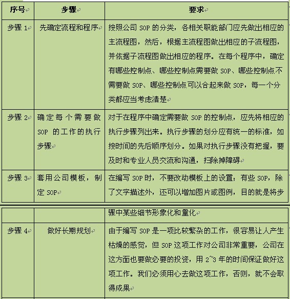 虽然制定SOP的方式可能由于不同的管理模式和管理方式有一定的差异,但大体上包括以下几个步骤,如表2-7所示。