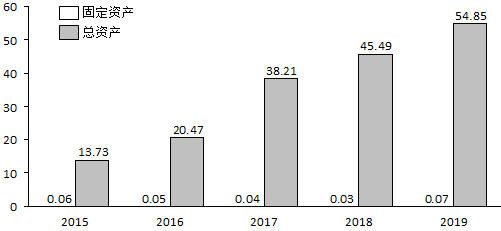 它每年的固定资产和总资产,都是以柱状图表示的。由于固定资产数值实在太小,在图中看不见了。它的总资产持续增长,到2019年底,已经达到50多亿元。可它的固定资产呢?还保持在几百万。