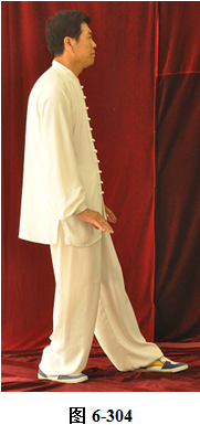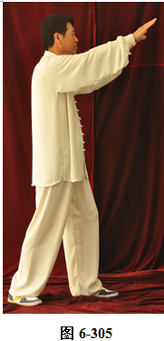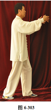 接上式,腰微拱,右腿弯曲,重心渐渐移向右腿。同时左掌经右臂下,向右外伸,并沿右臂向前外旋,使掌心翻转向前胸;右拳变掌称平,两掌指尖相对向左右拉开 略窄于肩。腰微拱,随开两臂内旋翻,使掌心朝下。随即腰向上提,两掌向上撮掤,上抬至略高于肩。重心前移呈左弓步,掌心向前,指尖朝上,眼神平视(见图6-303至6-305)。