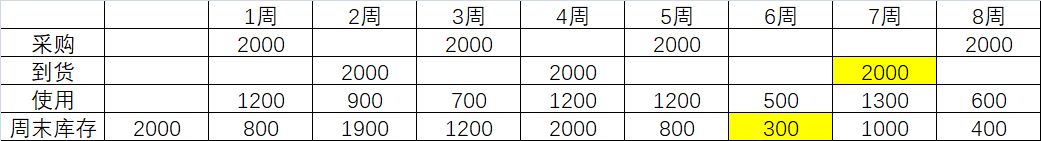 下面这个物料基本是2周采购一次,采购交期大约1周,采购批量是2吨,每周用量不超过1200公斤。在第5周下达的2吨的订单,正常应该第6周到货,结果第7周到货,可以看到,第6周车间用量是500公斤。第7周是1300公斤,这说明的第6周的一些生产订单推迟了。如表2-28所示。
