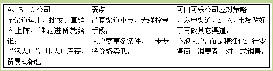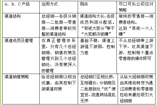 北京某大型企业的纯净水D品牌,曾号称北京第一品牌,沉寂几年后想东山再起、卷土重来。该企业下定决心,一定要将曾经失去的市场夺回来。它采取了对超市渠道、批发渠道、零售渠道全面出击,大投入、不计成本式的销售方式。但可口可乐公司抓住了它的渠道软肋,如表4-6所示。