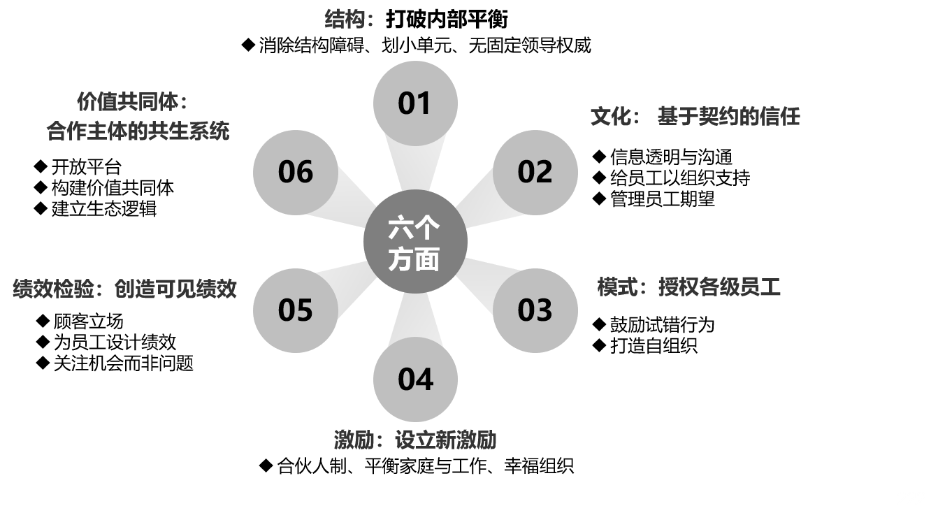 如何实现组织创新?可从结构、文化、模式、激励、绩效、价值共同体六个方面考虑。如图6-23所示。