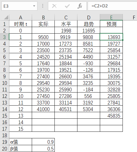 这样就得出了第1期的水平值为9919,趋势值为9808,预测值为13693,并如此类推,可以得到后续各期的水平值,趋势值和预测值。