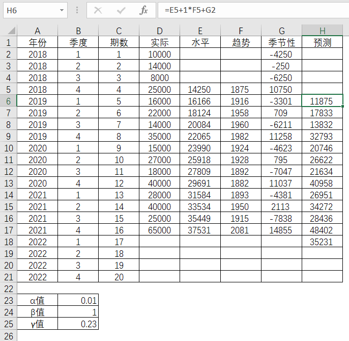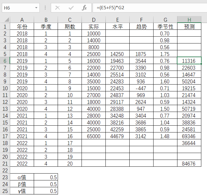 这样就得出了第5期(即2019年第1季度)的水平值为19463,趋势值为3544,季节性因子为0.76,预测值为11316,并如此类推,可以得到后续各期的水平值,趋势值和预测值。