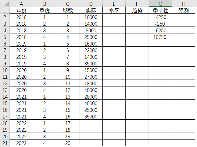 这样就得出了第5期(即2019年第1季度)的水平值为16166,趋势值为1916,季节性指数为-3301,预测值为11875,并如此类推,可以得到后续各期的水平值,趋势值和预测值。