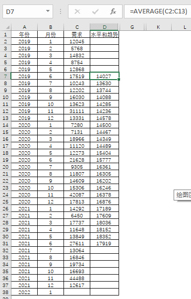 根据图,三年的趋势是上升且有季节性波动,如果采用2019年1月作为计算起点,那么趋势上升就会加快,出现在11期(2019年11月),反之采用2019年的12月,数据反应表现滞后,在24期(2020年12月)才有出现趋势上升。因此选择2019年6月这个中心做移动平均,表现适中。