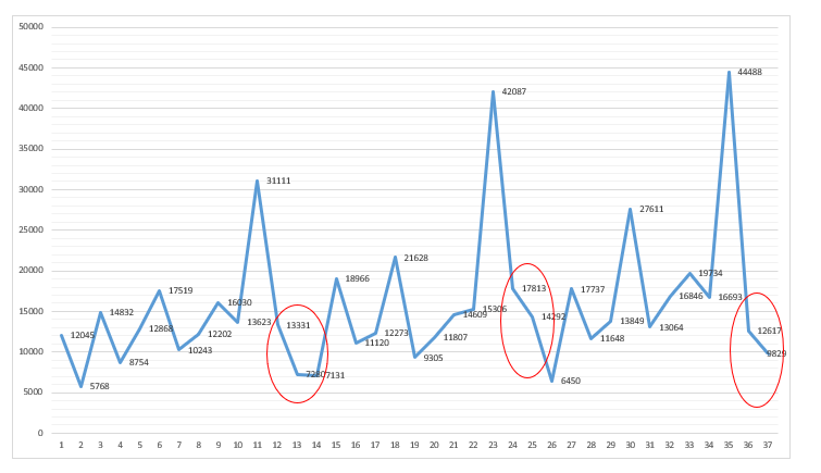 三年共36期的数据,每一年有12个月的数据,而季节性的因素是每12个月循环出现,比如3月,6月和11月都有明显的表现特征。