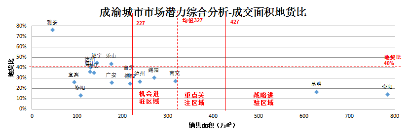 市场潜力从成交面积和地货比两个维度考虑,地货比较低且成交面积较大代表市场潜力较大。战略进驻区域城市共4个,分别为成都、重庆、贵阳及昆明;重点关注区域城市共0个;机会进驻区域城市共3个,分别为南充、绵阳及泸州。