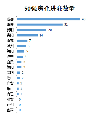 成都及重庆等城市TOP50房企进驻较多,市场竞争十分激烈;4个城市已经有10家以上TOP50房企进驻。