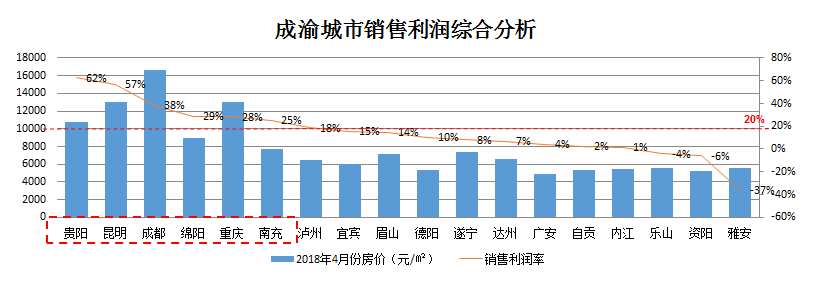 销售利润率=(房价-地价-土地外成本-增值税)/房价,土地外成本按3400元估算(重庆土地外成本按4000元/㎡测算,其余城市照3400元/㎡测算)。
