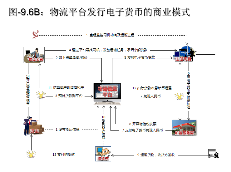 沿途服务点收到电子货币,汇集一定额度之后向金融平台兑现人民币,并同时开出增值税电子发票。客户接到货物并签收之后,平台再与物流公司结算运费,从中扣除贷款本息和平台服务费,把余下的人民币附上相应的增值税电子发票一同支付给物流公司。接着物流公司再扣除预付给司机的电子货币额度,与司机结算运输劳务费的尾款,然后用拿到手的增值税发票抵扣运输费的增值税款。这样一来,整个上游到下游的物流产业链,只因为注入了一笔电子货币的润滑剂,就可以顺畅运转起来了。