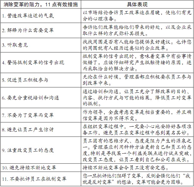 表8-2消除变革阻力的11个有效措施