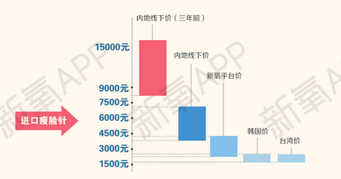 据新氧白皮书表示,几年来,针剂市场价下滑70%以上。一是因为药品中外价差大,有回落空间;二是因为消费透明,机构不再能看人报价;三是因为定价机制,机构以针剂为引流项目。