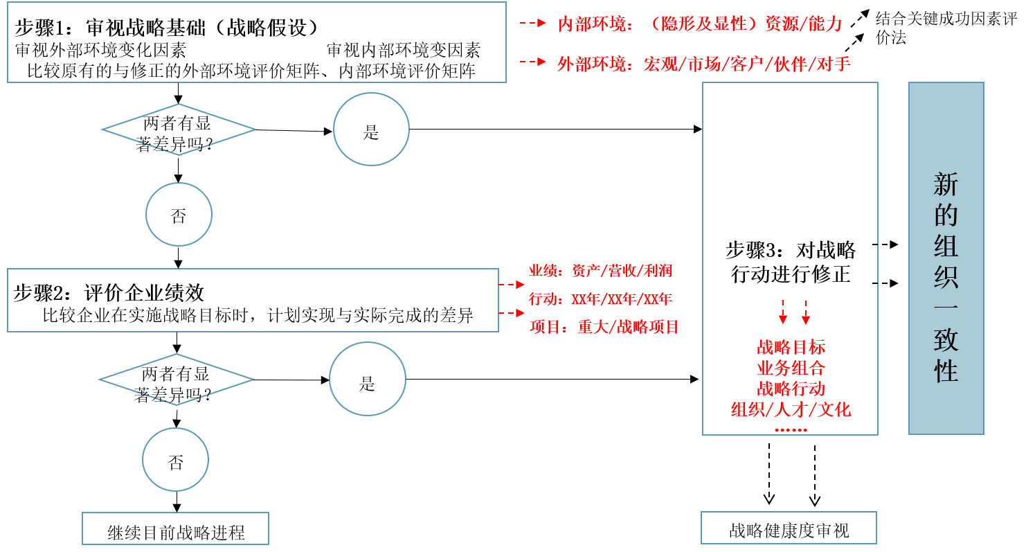 企业内部环境发生 重大变化吗? | 企业外部环境发生 重大变化吗? | 企业是否朝着既定 战略目标进行? | 结果 |
