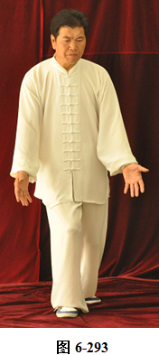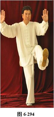 接上式,腰微拱,随之向右微转,重心微移左腿,右脚尖随腰外转之际朝向正南,重心随之前移至右腿上。两臂随腰后拱右转, 向左右外旋开,由松拳变掌划圆弧,随重心前移右腿之际,收回小腹前,两掌心朝上。左腿随腰后拱右转,向前屈膝,呈微蹲式。腰上提,右腿随之稍直立,提左膝,左脚经右腿内侧,屈膝上抬,两臂随腰上提向两侧前方伸开。左脚尖朝上,用足跟向左前方蹬出, 眼神注视左脚前方(见图6-293至6-294)。