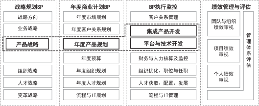 ● 企业战略涉及的内容和方向比较多,包括组织战略、人才战略、变革战略等。由于本书主要面向产品经理,所以重点讨论产品的战略制定到执行,包括产品战略的制定、年度产品规划、集成产品开发、平台与技术开发(见图 2-3)。对