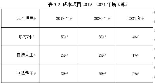 某企业在分析2019年至2021年的生产成本数据时,注意到成本项目如原材料、直接人工和制造费用的增长率在逐年变化。如表3-2所示,2021年的整体情况明显好于前两年,这引发了管理者的好奇:为什么会有这样的差异?