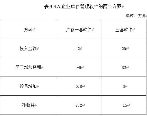 在决策过程中,管理者需要首先明确决策的动态数字化指标管理标准,确保决策的科学性和有效性。根据第一步骤的分析结果,决策负责人应进行深入的策略研讨,提出并拟订符合决策标准且不会增加企业额外资源和成本的策划方案。 以A企业为例,该企业面临库存管理不善的问题,导致效率低下。部门负责人提出了两个改善方案,并提供了相关的数字化指标数据。第一个方案是购买一套库存管理软件,投入金额为2万元,预计可以减少1名员工,增加净收益7.2万元。第二个方案是购买库存、采购和供应商三套软件,投入金额为20万元,需要增加2名技术员工和2名操作员工,但预计会减少净收益15万元。如表3-3所示。