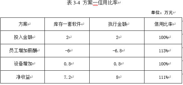 根据计算,方案一在净收益方面的信用比率为111%,表明实际净收益超过了预期目标。在员工薪酬减少方面,信用比率为113%,说明实际减少的员工薪酬也超过了预期目标。