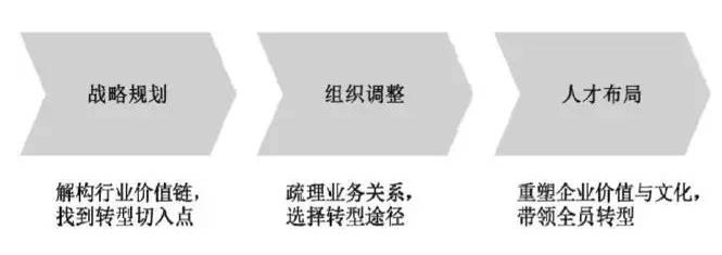 传统企业进行平台化的转型,关键的步骤主要有三个,分别是战略规划、组织调整和人才布局。如图2-1所示。