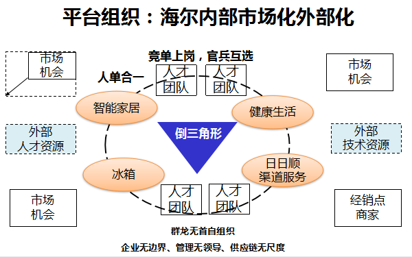 海尔的平台化变革如今已初见成效。海尔的平台有两类组织:小微和平台。目的是实现转型与创新。这些小微组织有了想法之后,则与每个平台组织合作。而每个平台组织,比如生产平台,下面设有N个生产小微、物流平台设有N个物流小微,海尔实行“人单合一”机制,每个创新小微和转型小微,可凭一定量的客户订单获得平台上其他小微的支持。比如请采购平台小微合理采购零部件,请销售平台小微帮助做产品营销等。小微间的彼此合作,是“市场化”选择的结果,自负盈亏。管理者只是把握公司总体的大方向,协调前端任务,做财务风控即可。