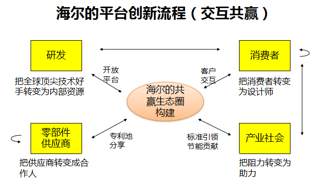 海尔只有平台和小微。一方面,平台为小微提供开放的资源支持;另一方面,通过开放地吸引资源、快速地聚散资源,使海尔平台生态更丰富,从而吸引更多的小微到平台创业、快速变现价值,使相关方利益最大化。